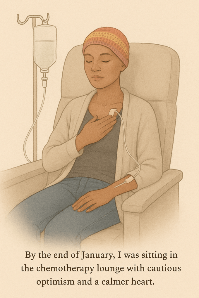 By the end of January, I was no longer planning my long-awaited trip to California. I was sitting in the chemotherapy lounge still uncertain, with cautious optimism, a calmer heart and a gentle whisper…