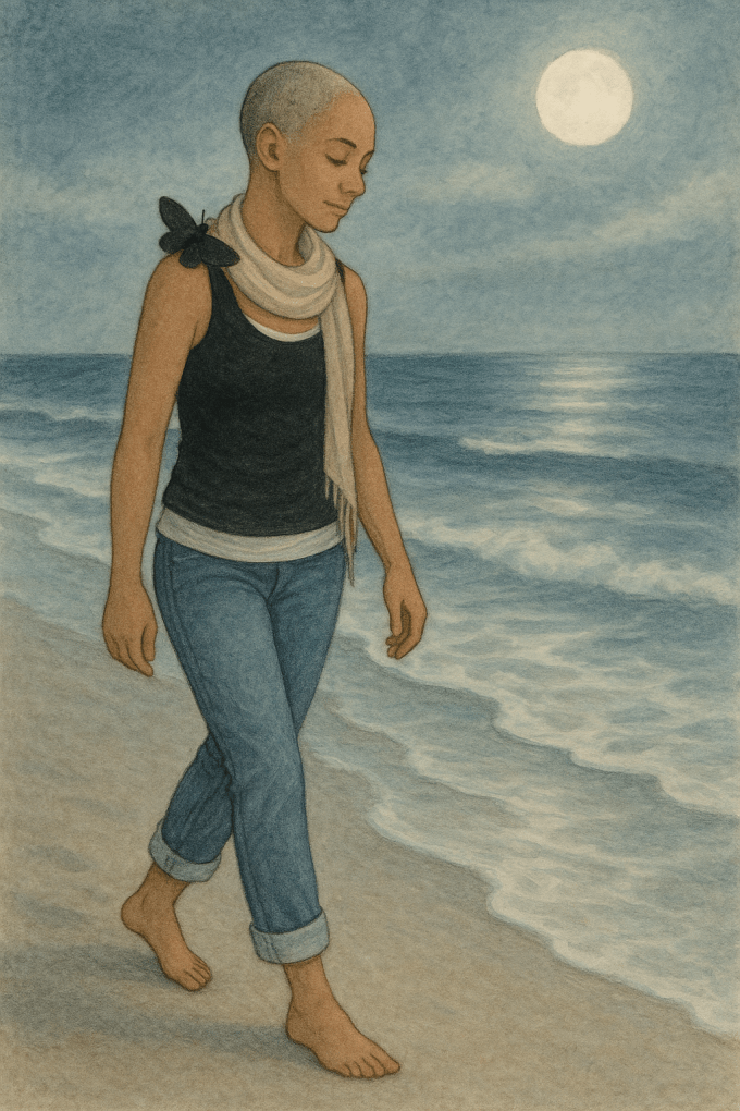 I dreamt deeply. In sleep, a lover’s embrace held me, soft and safe, as though the universe itself leaned in to comfort. Slowly waking, I felt the echo of a phantom kiss linger at my lips. When my eyes opened, I found the moth resting on the pillow beside me, as though he had landed there with a quiet need to rest.